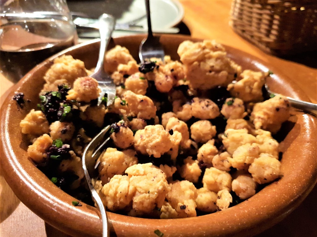 Course 1 – Chickpeas with chickpea flower, fried olives, thyme & salt