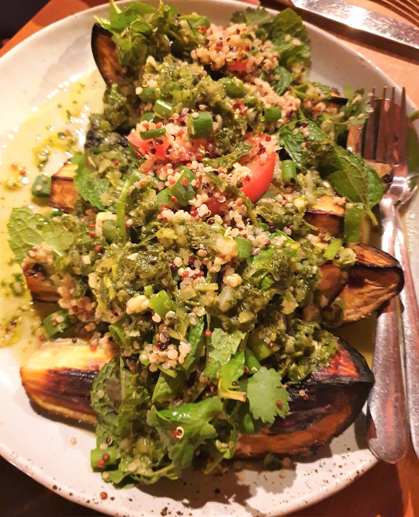 Course 5 – Eggplant with, I want to say, mint & pesto & also quinoa…?