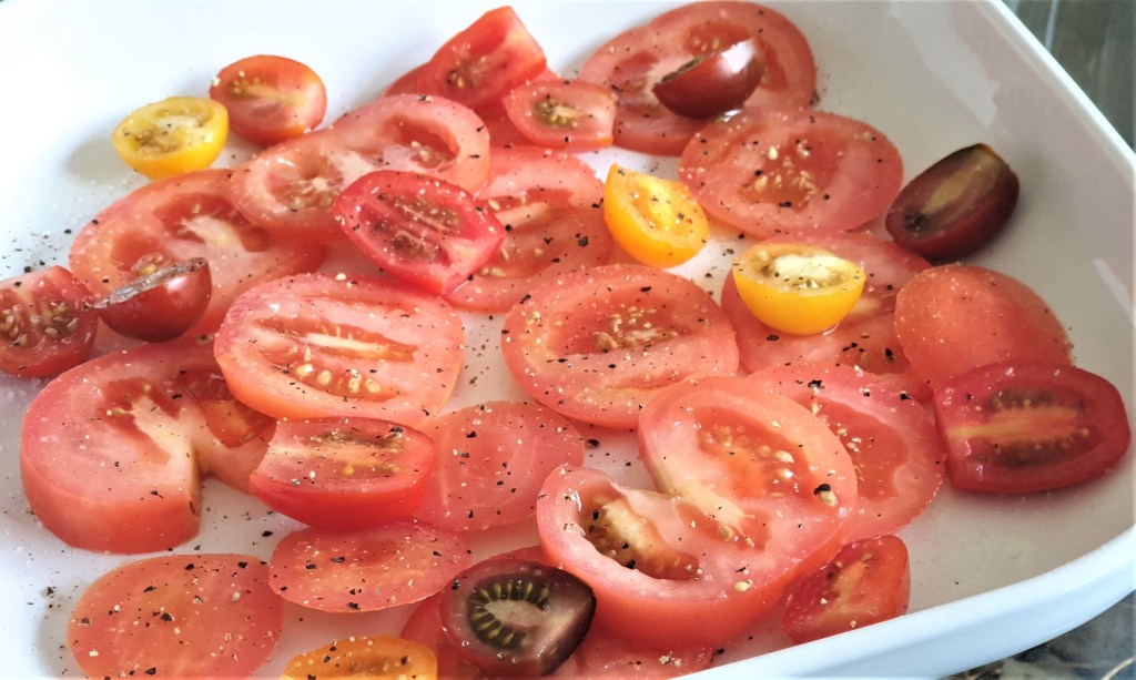 - First things first, slice up all of your tomatoes and lay them on the big, flat serving plate, seasoning generously with salt and pepper (tomatoes & salt are BEST friends; go hard).