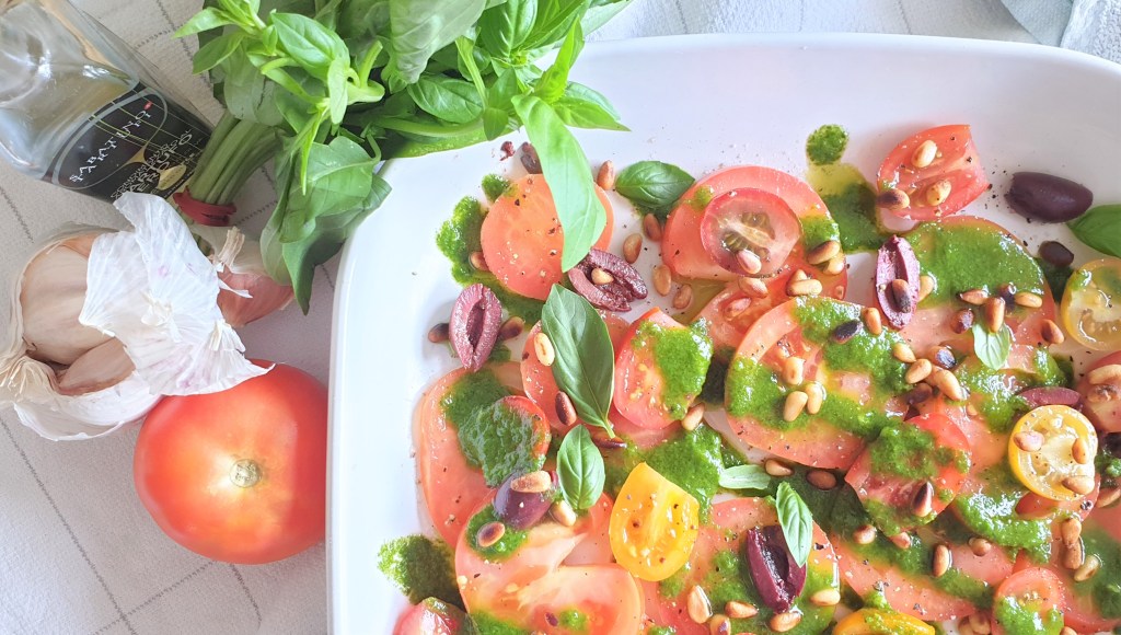 Day 1 of Corona Virus self-isolation and I have a LOT of tomatoes in the fridge. Luckily, I also have a bunch of fresh basil and some other pantry staples. So, with my new found time, I thought I’d create a super simple, bright, fresh & zingy tomato and basil salad to boost immunity & wake me up!